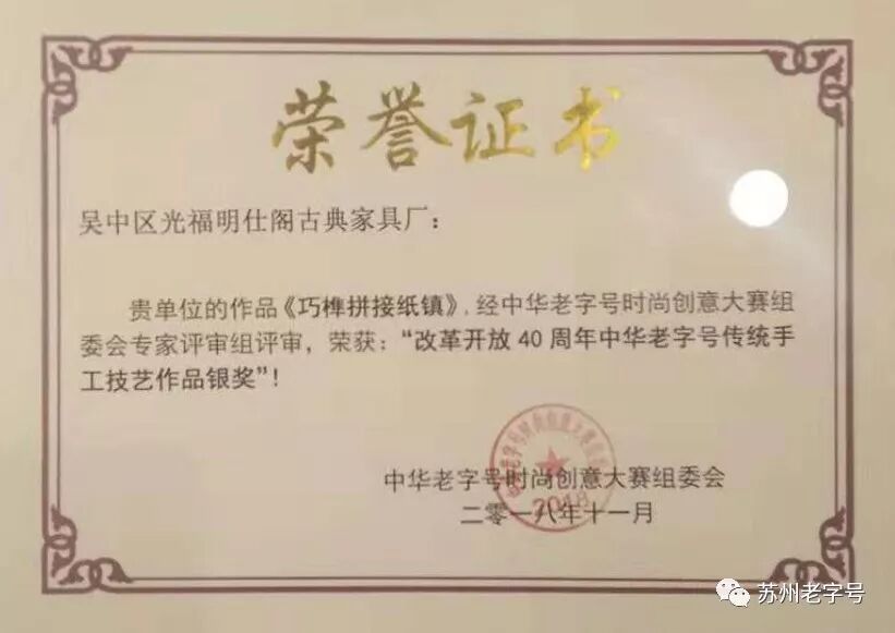 改革开放40周年中华老字号传统手工技艺作品 银奖