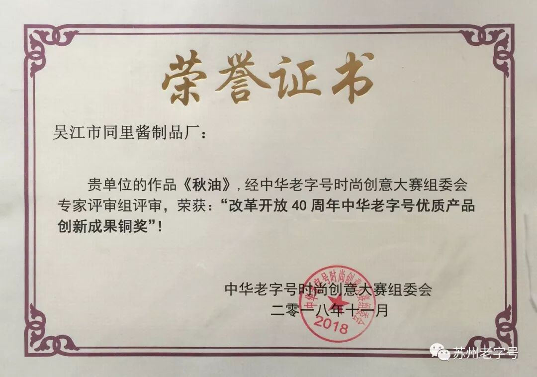 改革开放40周年中华老字号优质产品创新成果 铜奖